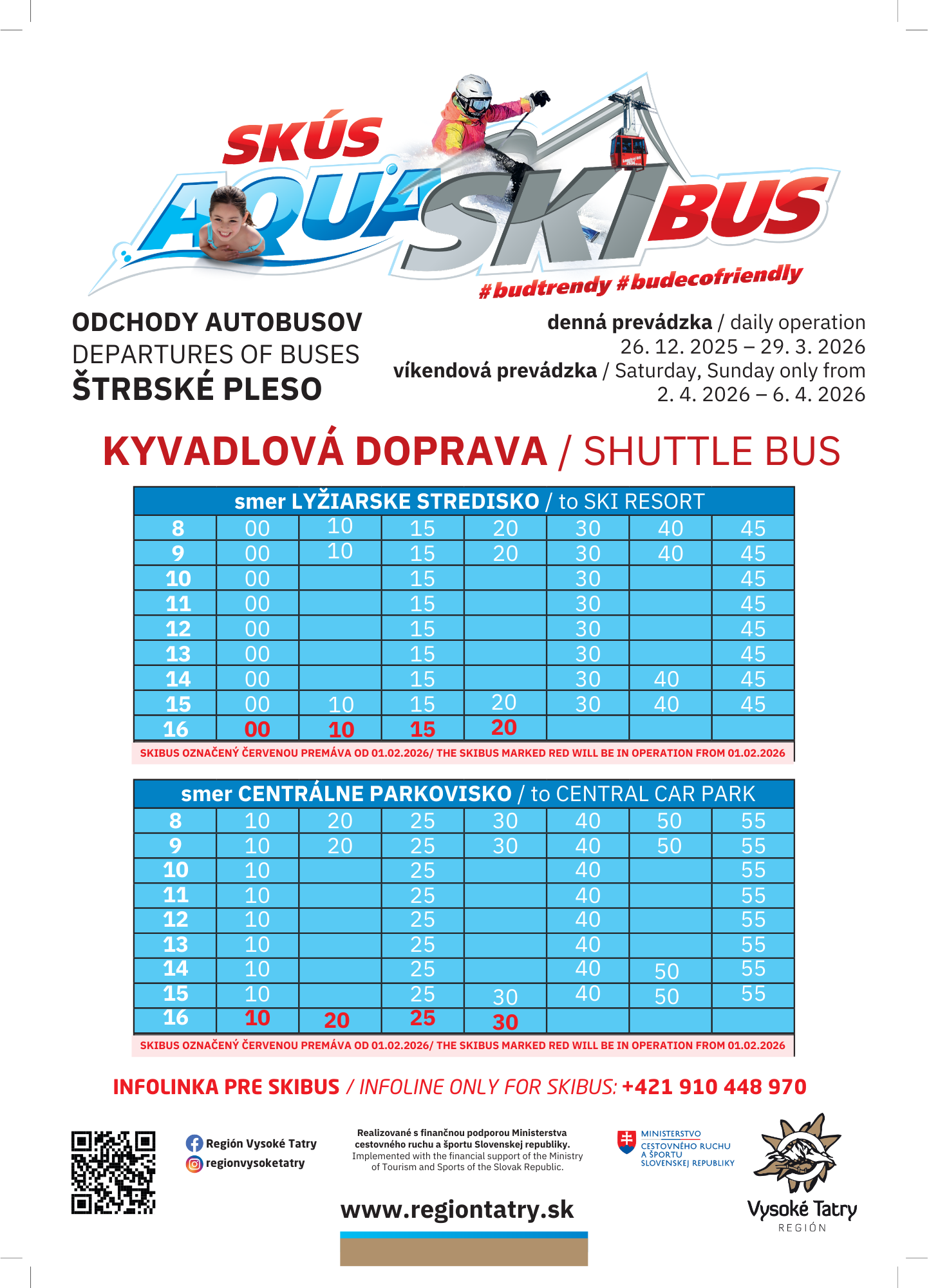 In der Wintersaison sind hauptsächlich für Skiläufer und GOPASS-Karte-Inhaber regionale SKI & AQUA BUSSE zur Verfügung, um sie zwischen 6.12.2025 und 6.4.2026 bequem und kostenlos in die Skigebiete Tatranská Lomnica, Štrbské Pleso und zum Wasserpark AquaCityPoprad zu fahren.