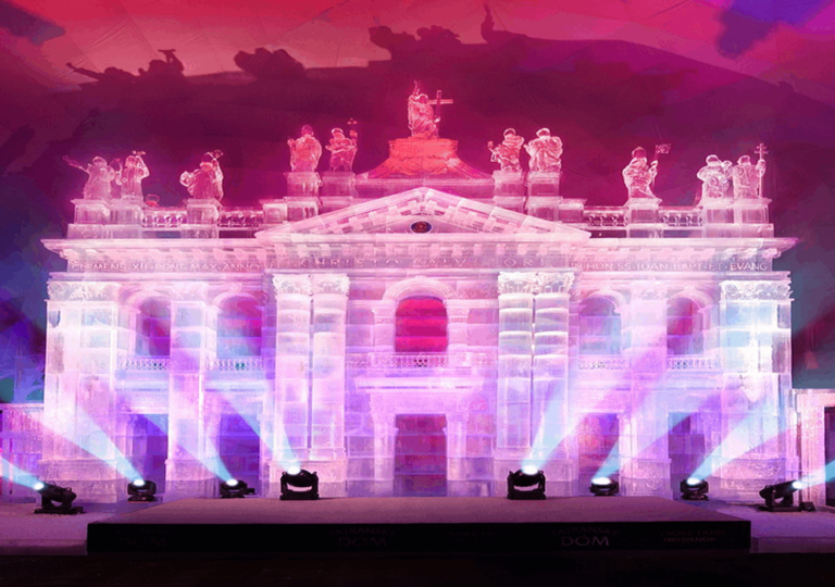 Das diesjährige Werk aus 225 Tonnen Eis und 1.800 Eisblöcken ist von der Lateranbasilika in Rom inspiriert – der Hauptkirche der Stadt und dem offiziellen Sitz des Papstes als Bischof von Rom.