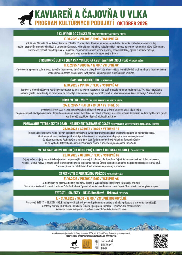 Kultúrny program v Kaviarni a čajovni U Vlka v Starom Smokovci na mesiac október 2025.