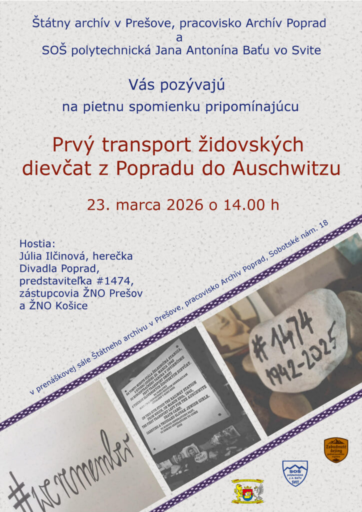 Dňa 23. marca 2026 o 14.00 h Vás pozývame na pietnu spomienku pripomínajúcu prvý transport 999 židovských dievčat z Popradu do Auschwitzu. Pripravili sme ju v spolupráci so žiakmi a učiteľmi Strednej odbornej školy polytechnickej Jana Antonína Baťu vo Svite. Pozvanie na podujatie prijala aj Júlia Ilčinová, herečka Divadla Poprad, predstaviteľka #1474 v predstavení Zažiť Poprad a umrieť, tiež zástupcovia Židovskej náboženskej obce v Košiciach a Prešove.
