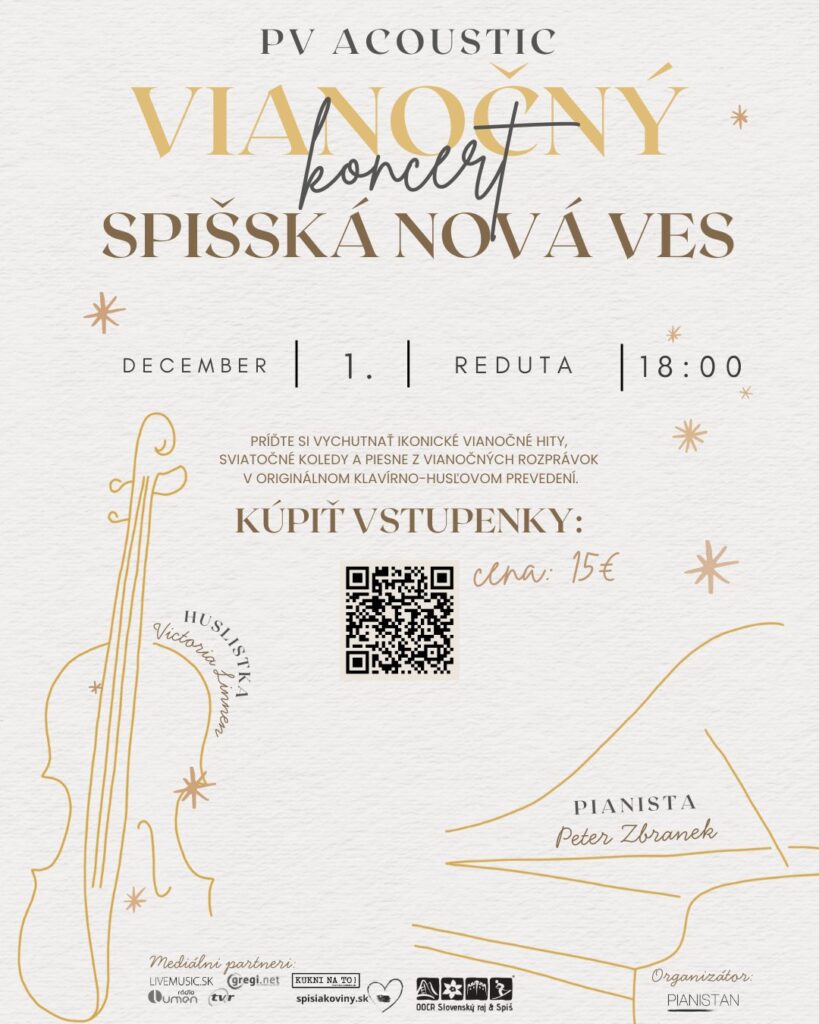 Po úspešnom minuloročnom turné, ktoré zaplnilo sály po celom Slovensku, zavíta duo PV Acoustic so svojím nádherným vianočným koncertom aj do Spišskej Novej Vsi! Príďte si vychutnať nezabudnuteľný umelecký zážitok a stráviť príjemný večer plný sviatočnej hudby, ktorá vám zaručene vyčarí úsmev na tvári. Môžete sa tešiť na tradičné koledy, známe piesne z obľúbených vianočných rozprávok i najväčšie domáce a zahraničné hity Vianoc v unikátnom podaní klavíra a huslí.
